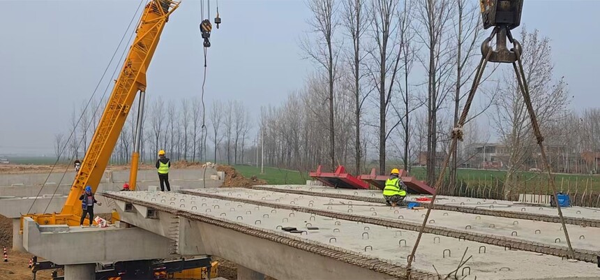 國(guó)道107駐馬店境東移改建工程南段加快橋梁工程建設(shè)國(guó)道107駐馬店境東移改建工程 南段加快橋梁工程建設(shè) 12月30日,在國(guó)道107駐馬店境東移改建工程南段韓溪河橋的梁板架設(shè)現(xiàn)場(chǎng),隨著施工人員一聲令下,高大的吊車伸出鐵臂穩(wěn)穩(wěn)地吊起箱梁,緩緩平移至橋墩上方。施工人員緊密配合,精細(xì)調(diào)整落位,梁板嚴(yán)絲合縫地安放在支座上,橋面瞬間向前延伸。